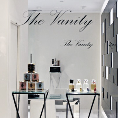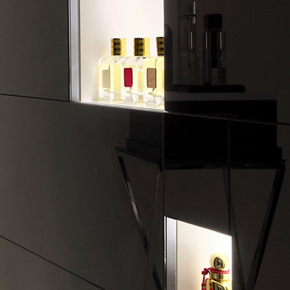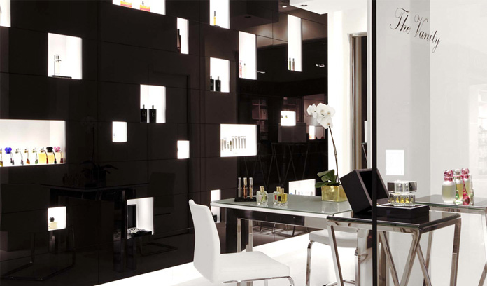 Un mueble lacado en negro colgado en la pared opuesta a los escaparates, con espacios blancos horadados en su superficie e intensamente iluminados, muestran las esencias y perfumes en sus envases. El color piedra caliza recubre el resto de las paredes, los techos y el suelo. La mesa mostrador y las sillas diseñadas en blanco polar y acero cromado brillo. Únicamente los elementos esenciales en un espacio donde las fragancias son las protagonistas del diseño.