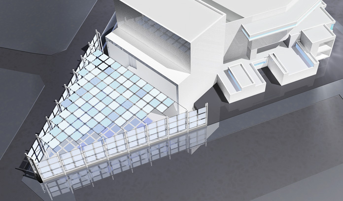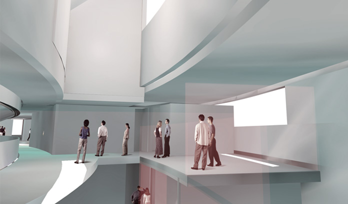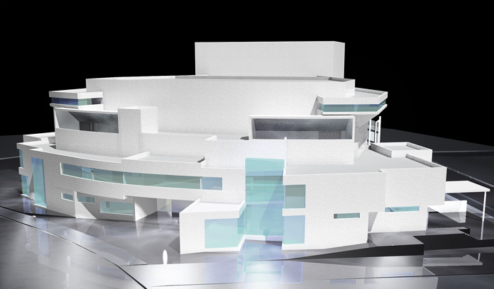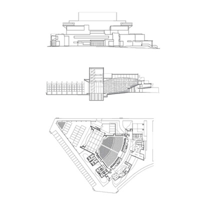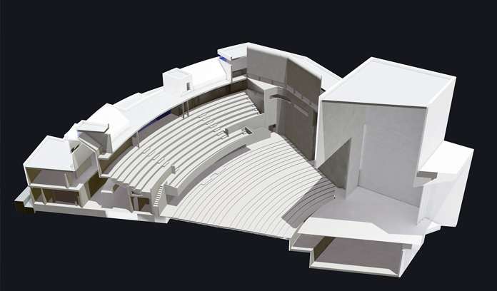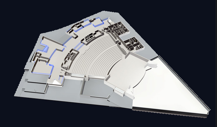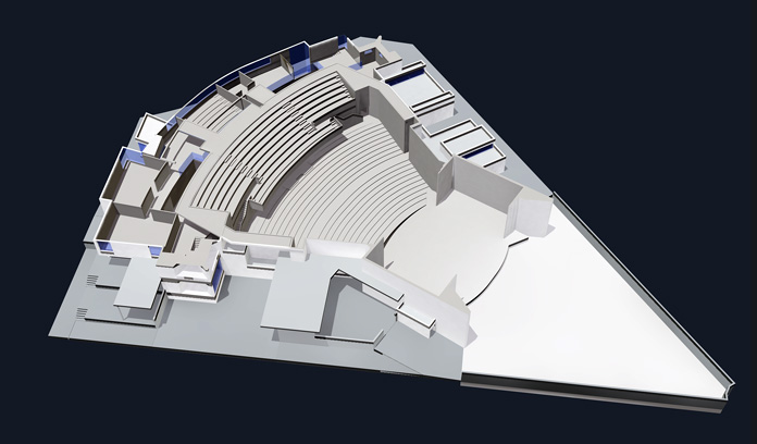 La caja escénica es un prisma que emerge del conjunto, con dos proscenios situados en caras opuestas que se abren al recinto del auditorio y del espacio abierto. El auditorio se dimensiona para optimizar las condiciones visuales y de acústica de cada uno de los asientos, estableciendo las condiciones de inclinación y curvatura más adecuadas en cada caso. En los accesos se sitúan espacios de exposición y enseñanza relacionados con las artes escénicas.