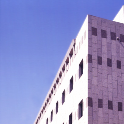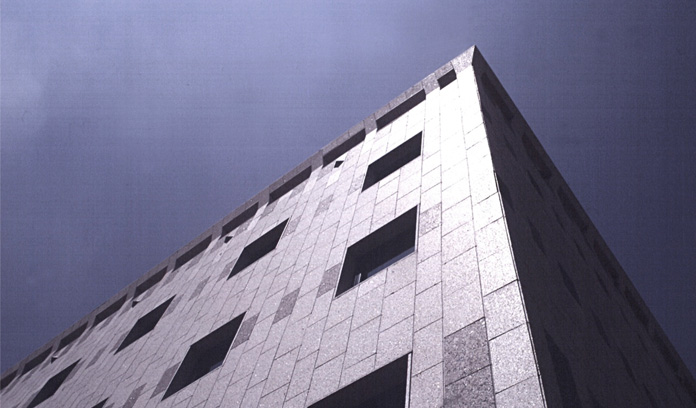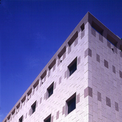 El revestimiento, los huecos, el remate de la cornisa en la coronación inclinada apoyado sobre pilastras y los resaltes de granito macizo son elementos conjugados en el diseño de la fachada ventilada de doble piel.