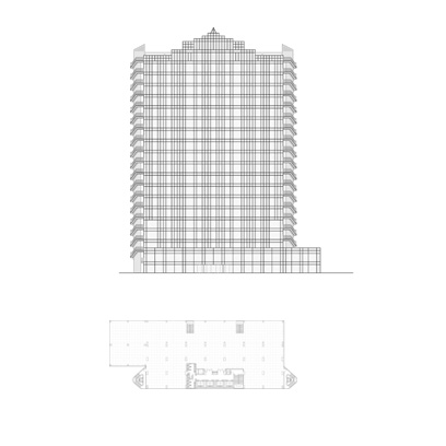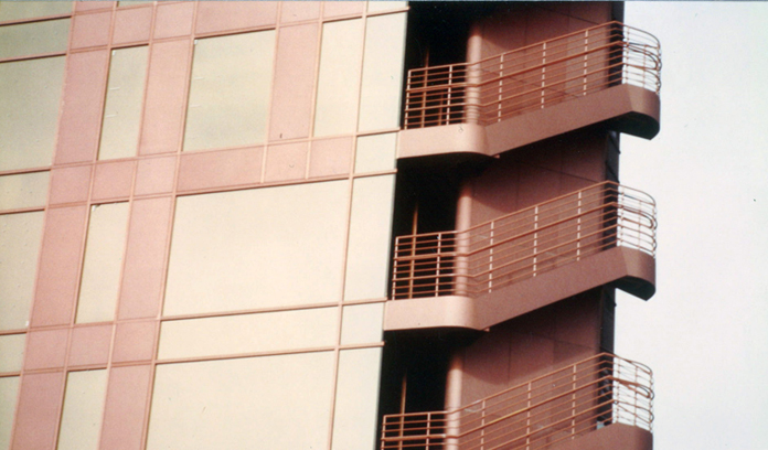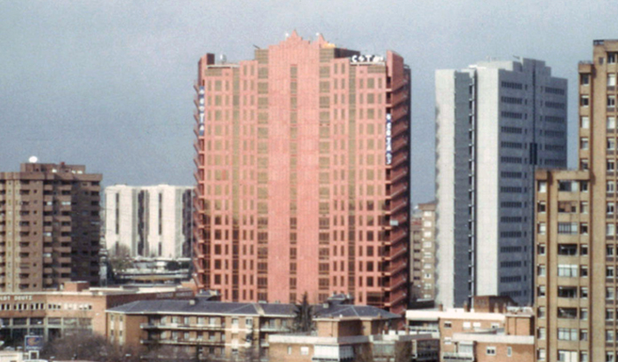La composición de la envolvente del edificio combina aluminio anodizado cobre y vidrios pink rosa Parsol en paneles que se insertan en la modulación de techos, paredes y suelos que caracteriza los edificios con este concepto tecnológico originario en algunos de los edificios de la gran manzana durante el último tercio del S. XX.