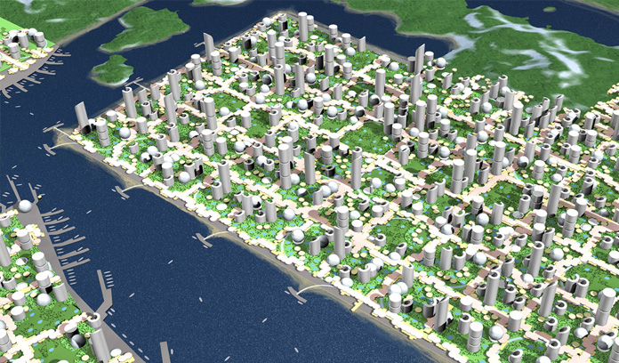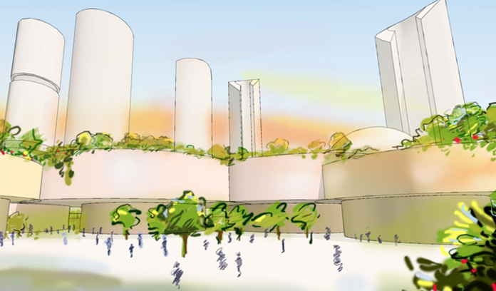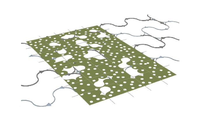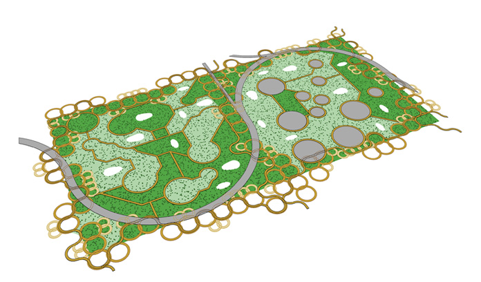 mediante zonas ajardinadas que tapizan su suelo y forman