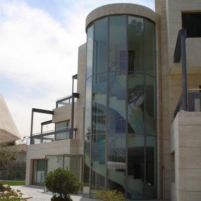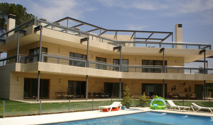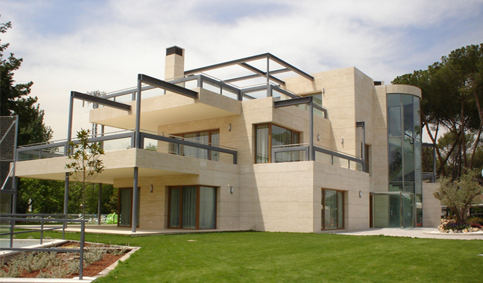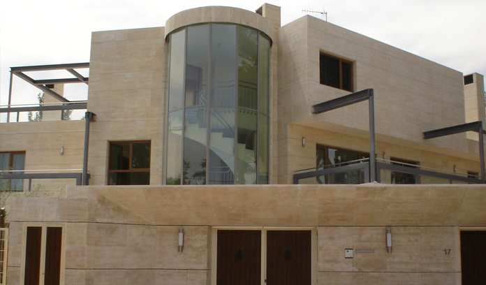 El color gris forja de la estructura, de las carpinterías y de las cerrajerías, destaca sobre el cálido color beige de la piedra caliza del revestimiento, y los fondos de los amplios ventanales acristalados.