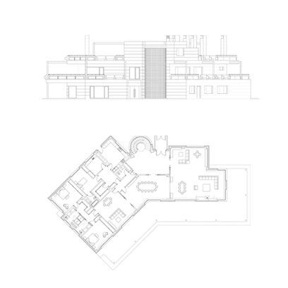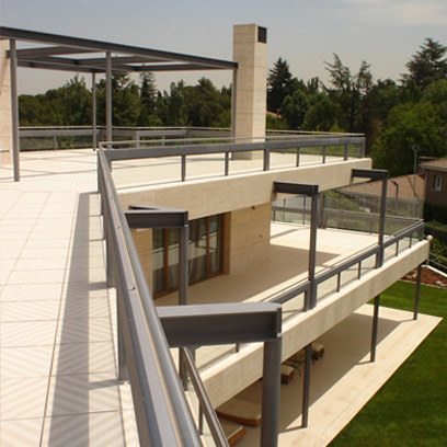 Una esbelta escalera circular comunica los vestíbulos de las dos plantas, bordeadas por amplios porches y terrazas con vistas al espacio exterior ajardinado situado a mediodía.