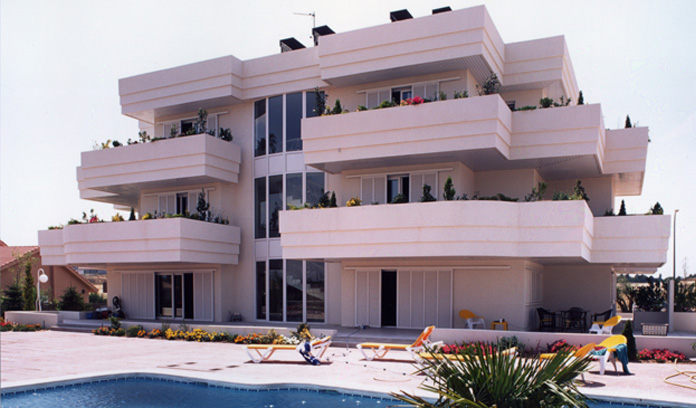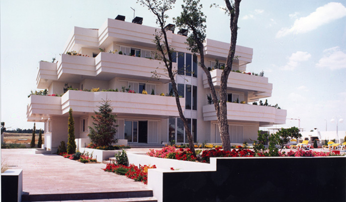 El vestíbulo diseñado como un espacio común enlaza visualmente los diferentes niveles y los jardines. Todas las dependencias tienen acceso a las terrazas que bordean el edificio, rematadas exteriormente con resaltes horizontales superpuestos, evocando el arquitrabe del templo romano de Marte del Foro de Augusto en Roma.
