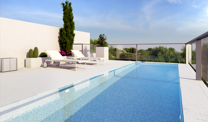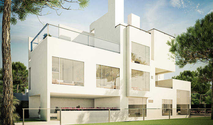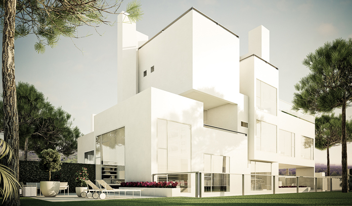 La superposición de volúmenes cúbicos de hormigón visto, los salones de doble altura, los grandes ventanales, la disposición de porches y terrazas, la ubicación elevada del espacio wellness y la integración de las edificaciones en el paisaje son las señas de identidad de estas viviendas.