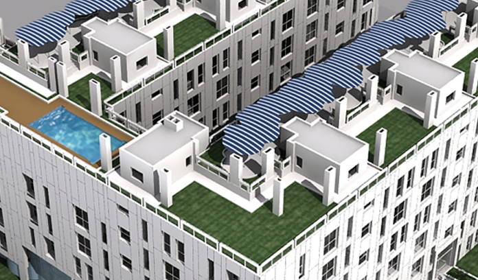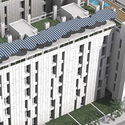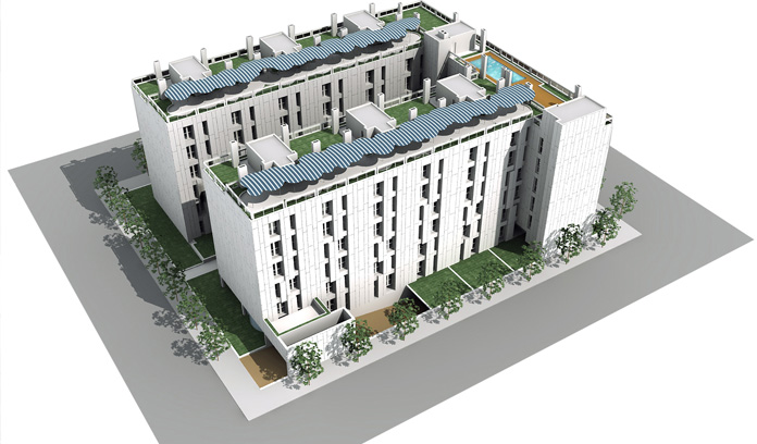 This housing complex is designed bearing in mind bioclimatic performance and use of renewable energies. The swimming pool and leisure areas are located on the top of the buildings with shadow structures that support photovoltaic panels and regulate solar radiation.