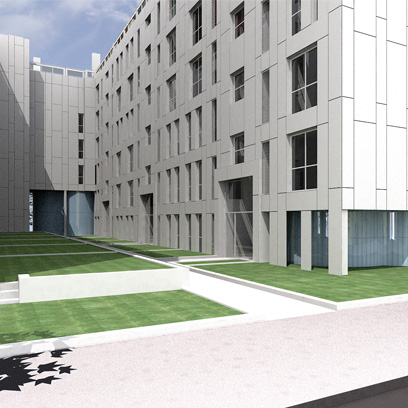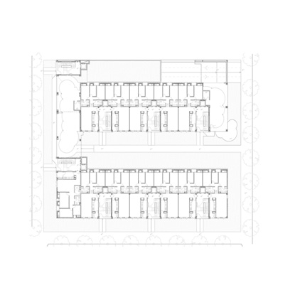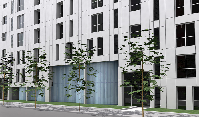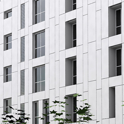 A gym and a game room are placed on the public areas of the ground floor while private gardens are attached to the ground floor houses. For the facades design, concrete panels are combined with vertical holes and glazed parapets.